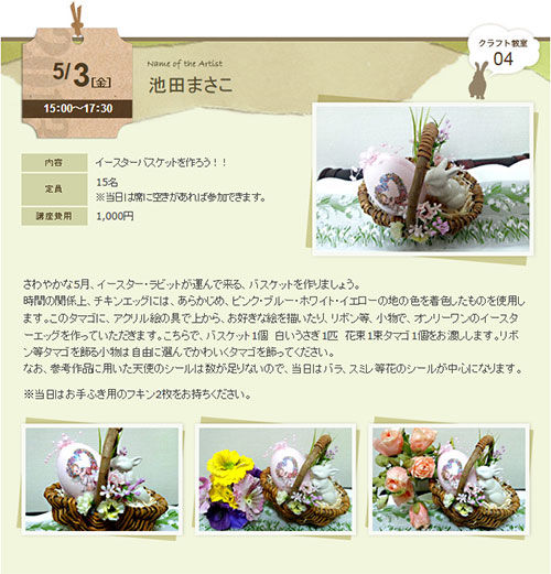 池田まさこさんのイースターエッグバスケットは卵に直接絵を描いたり、シールやリボンを飾って、オリジナルのイースターエッグを作ります。イースター(復活祭)はこのイースターエッグとうさぎが象徴的。かわいくデザインしたオリジナルのイースターエッグを作ってみませんか。