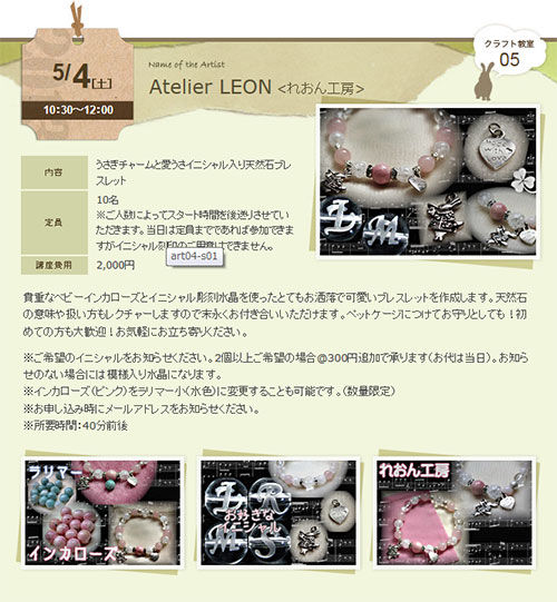 こちらはもこもこモコちゃんのうさぎのパーツを使って作るブレスレット。天然石を使って作ります。いろんな種類の天然石が用意されてるからまず石を選ぶことも楽しみの一つです。シルバーパーツはもこもこモコちゃん手造りのオリジナルパーツ。気になる方はブログをチェック!