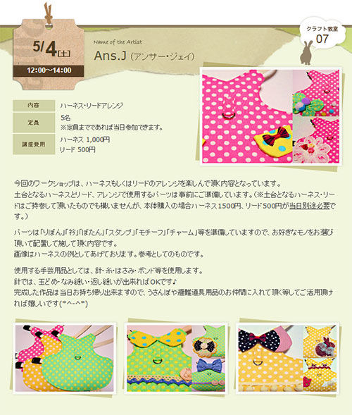 Ans.Jさんのハーネス・リードアレンジは土台となるハーネス・リードにリボンや襟、ボタンをつけてオリジナルのハーネス・リードを楽しむことが出来ます。ハーネス・リードはご持参いただいてもOK。購入もできます。(ハーネス 1500円、リード 500円)