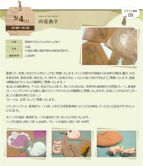 サシェは香り袋のことだよ。気にいった型を選んで、自分で布地を染めてオリジナルのサシェを作ることが出来ます。香りはうさちゃんの形をした素焼きのプレートにしみこませます。自分のお気に入りの香りを持参してもOKですよ。
