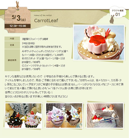 Carrot Leafさんのクラフト教室はスイーツデコのパーツを使った小物作り。ポケットティッシュケース、ガラスポット、マグネットの3つの中から選んで好きなものを作れます。ご予約があれば、おうちのうさちゃんに似せたパーツで作ることもできますのでお早めにどうぞっ。