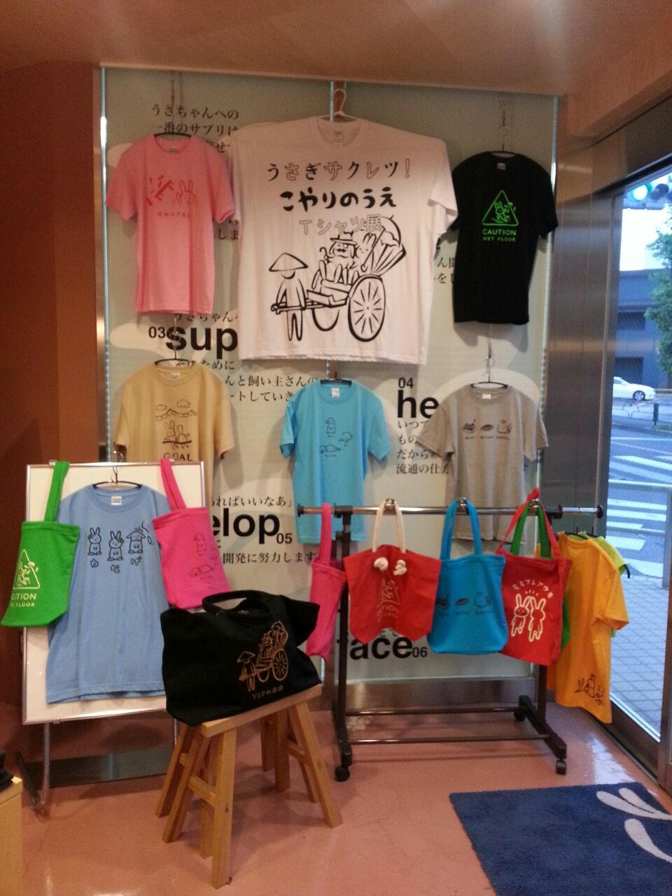 今、柴又店では「うさぎサクレツ!こやりのうえTシャツ展」開催中です
