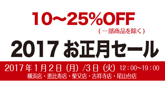 横浜店、恵比寿店、柴又店、尾山台店、吉祥寺店は1月2日、3日が初売りセールとなります。二子玉川店は2日より通常営業となります。(二子玉川店ではセールは開催いたしません。)