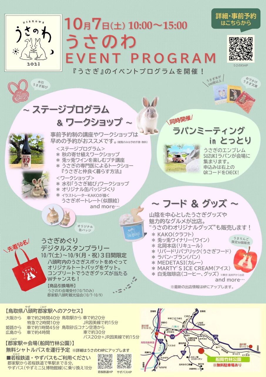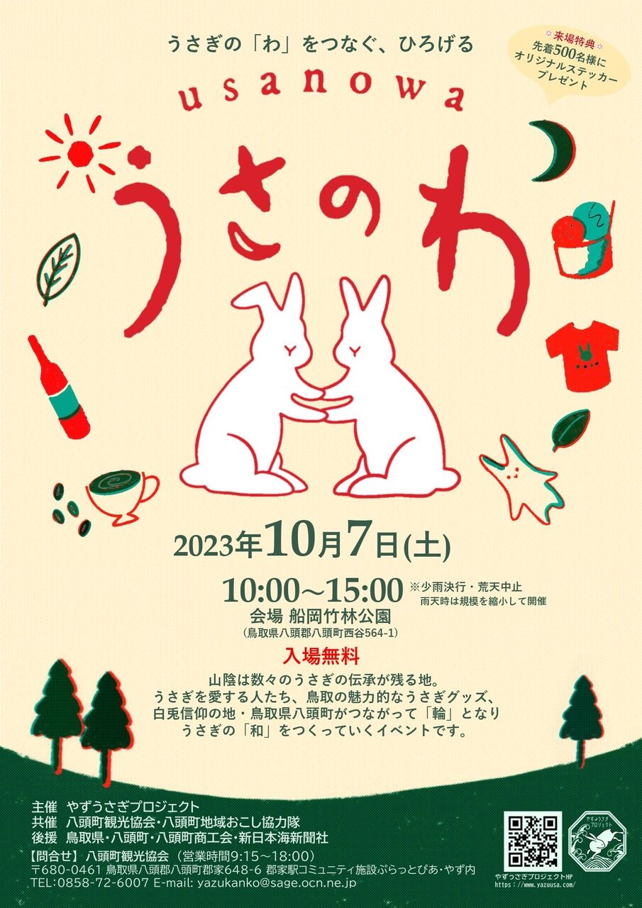 10月7日(土)に、そんなうさぎに強いゆかりのある地、八頭町でうさぎのイベント「うさのわ」を開催するとのことで、みなさんにご紹介できればと思います