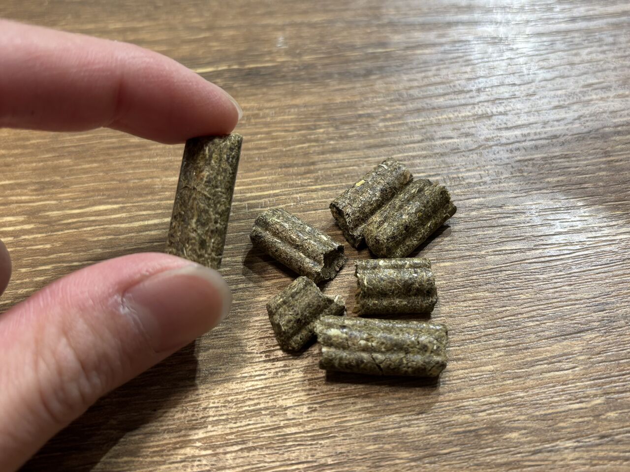粒がとても大きく、植物を粉にせず繊維が多いまま固めた商品です。
