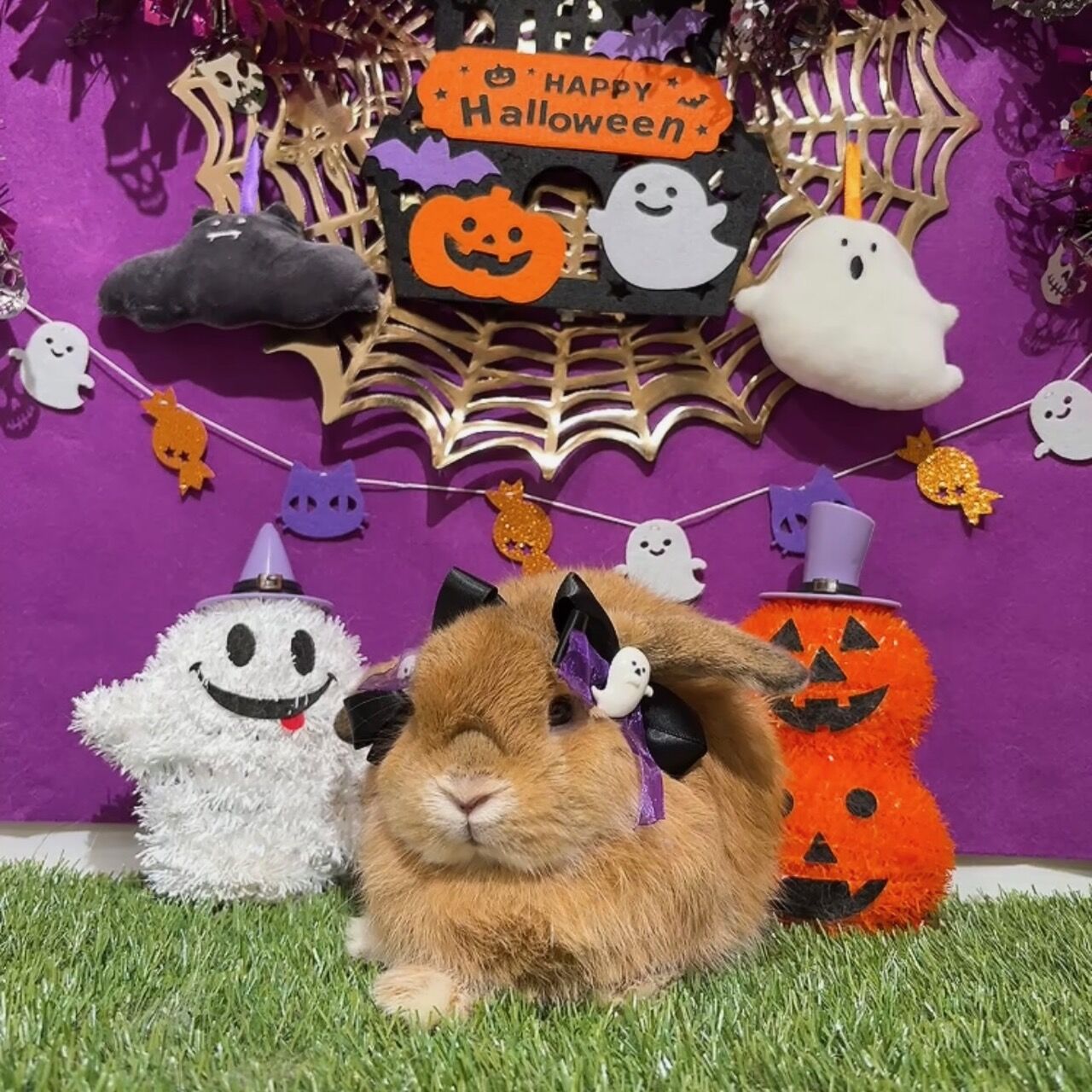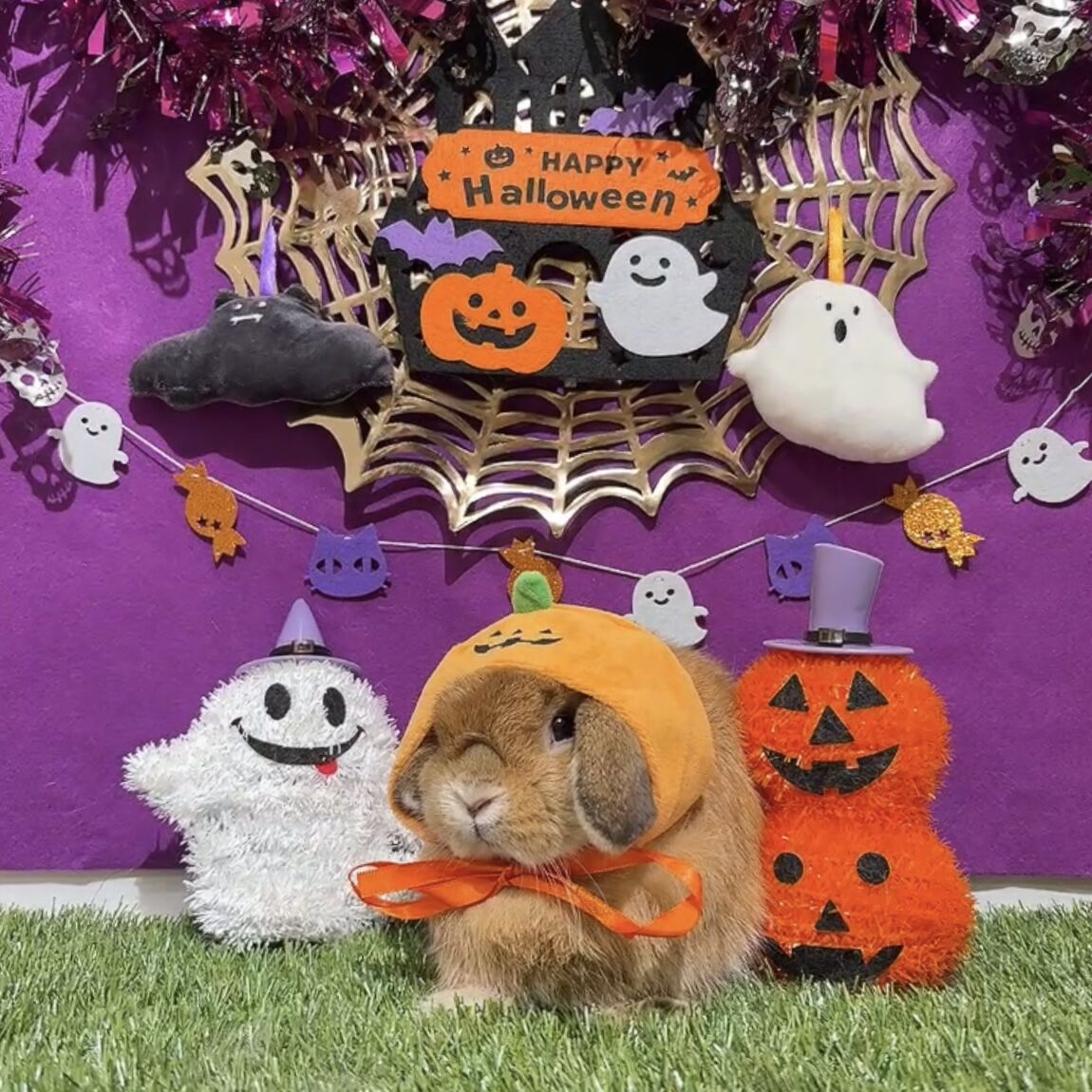 背景はおばけや魔女がいるこわかわいいデザインになっており、周りはかぼちゃやおばけのおきもので囲まれた撮影ブースとなっております!